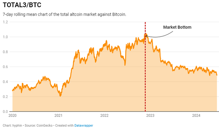 通过直接绘制比特币与其他所有山寨币(不包括以太坊)市值的图表更好地说明这一现象,显示比特币市值占比持续增加。