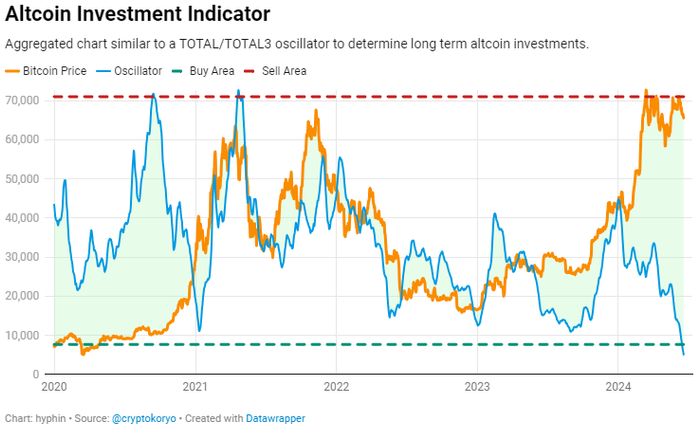 事实证明,主要资产与其他资产之间的相关性对于确定市场的当前状况非常有用。通过合并一个跟踪两者之间差异的振荡情况(蓝线),可以配置参与水平并随后用于融合。低振荡值加上比特币价格上涨,通常被视为买入的理由,因为假设山寨币被低估,并最终会修复并追随比特币走势。最近的数据显示,山寨币的看涨期逐渐变得更短、更弱,刺激了短期投资,而不是不确定的较长时间框架的投资。