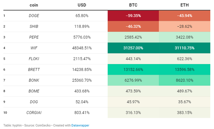 Memecoins 的总估值百分比变化并没有像人们预期的那样大,因为狗狗币和Shib等币占据了近一半的市场份额,但几乎没有上涨。除了以太坊上一些非常成功的代币之外,大部分Meme活动都发生在 Solana 以及最近的 Base 上。最高回报率和新进入前10的三个Meme代币来自 Solana,其中两个Meme币的回报超过五位数。