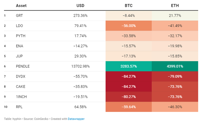 抛开创新和产品市场契合度不谈,DeFi(不包括1.0)代币的价格回报简直是可怕的,因为除了 Pendle 和 The Graph 之外的所有项目都一败涂地。过去几年,流动性质押市场出现了大规模增长和采用,但代表流动性包装器的治理代币却没有这样。与去中心化交易所相关的代币在所有代币中遭受最严重的价格波动,只有 Jupiter 保持绿色。