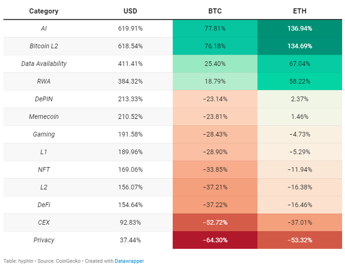 显而易见,随着时间的推移,情况已经发生了变化,为了超越指数,识别趋势和叙事变得比以往任何时候都更加重要。一切加密货币普遍上涨的日子似乎已经结束了。流动性分散和交易量下降将大部分显著收益集中到了少数几个赛道。虽然一般指标表明山寨币作为一个整体处于困境,增值幅度很小,但它们确实掩盖了单个资产群体的不同增长。