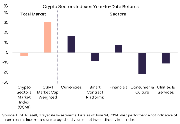 自 2024 年初以来,尽管比特币的价格上涨了约 50%,但我们的加密行业市场指数 (CSMI) 实际上下降了约 3%(图表 2)。五个加密行业的资产和总 CSMI 按其市值的平方根进行加权,以减少比特币的主导地位并更好地代表整个行业更广泛的资产。