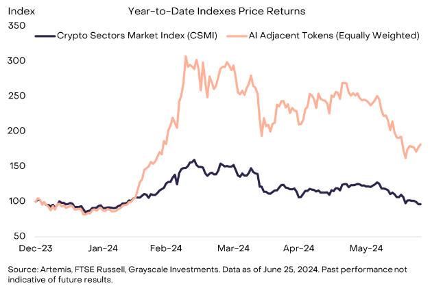 相对而言,一个亮点是部分与人工智能(AI)技术相关的资产,这些资产存在于智能合约平台加密部门和公用事业与服务加密部门。这些协议试图解决与人工智能相关的问题(例如,机器人和深度伪造、隐私、模型验证),提供对人工智能开发至关重要的资源(例如,计算、存储、数据),或为人工智能相关服务提供通用平台。年初至今,与整个加密市场的小幅下跌相比,一篮子与人工智能相关的加密行业代币的加权指数增长了80%(图4)。