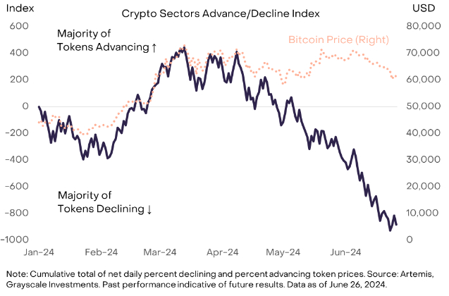 根据这一衡量标准,加密货币市场广度在 2024 年 3 月下旬/4 月初左右达到顶峰,此后一直在下降。今年迄今为止,尽管比特币涨幅巨大,但只有约 30% 的加密行业代币价格上涨。