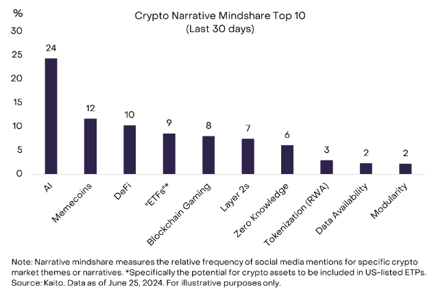 除了人工智能之外,市场参与者还关注各种其他主题,这在一定程度上影响了整个加密行业的相对表现。为了帮助我们了解市场趋势,灰度研究采用了数据提供商 Kaito 的“叙事思维份额”衡量标准。这些数据衡量了社交媒体提及特定加密市场主题或叙述的相对频率,这有助于评估由经常在社交媒体平台上表达观点的信徒和支持者社区驱动的加密资产。