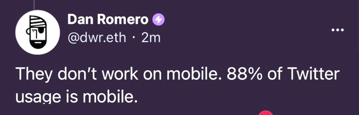 此外,Farcaster的创始人Dan Romero在评论时表示,“它们不能在手机上工作。88%的Twitter使用是移动的”,对此有网友反驳Dan Romero,Solana生态还有自己的Web3手机。