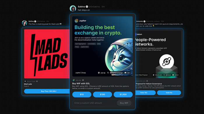 开发者不需要再为了每个适配的页面单独做开发或者单独调用类似Jupiter的API接口,一个链接适用所有页面。对用户来说,未来在推特上看到一个Solana的金狗项目,也不用先复制代币地址再打开交易所或者机器人进行交互,直接在一个界面里就能完成交易过程,加快了冲土狗的效率。
