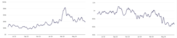 链上活跃地址数量(右图)在3月之后也出现大幅下降,活跃地址数目前已不足70w,较2024年峰值已回落超过30%,与2018年同期几乎持平。