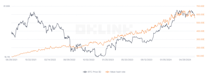 矿工群体在比特币网络中扮演着重要角色,但由于减半事件影响,加上铭文符文等概念趋于平静后手续费大幅缩减,矿工群体的收入状况近期并不乐观,单位算力收益达到有史以来的最低水平。OKLink数据显示,过去两个月,比特币网络的单位算力收益多次跌破0.05美元,尽管期间有过短暂反弹,但如今再次回落至相对低点。