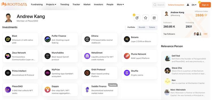 根据@CryptoRank_io网站数据,Kang 最新且相当知名的投资是 @Blast_L2 和 @puffer_finance,除此以外,他还投资了NFT抵押借贷平台MetaStreet、 Solana 生态跨链通信网络 Zeus Network(且为领投机构)、加密游戏博彩平台 Shuffle、Blast 生态借贷项目 Orbit Protocol、RWA Layer 2 网络 Plume Network 等一众项目。