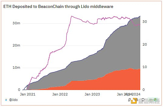 2024 年,这些有争议的对话已经转移到边缘,同时 Lido 质押的 ETH 份额下降到似乎更可接受的 29%(紫线),这是自 2022 年 4 月以来的最低水平。