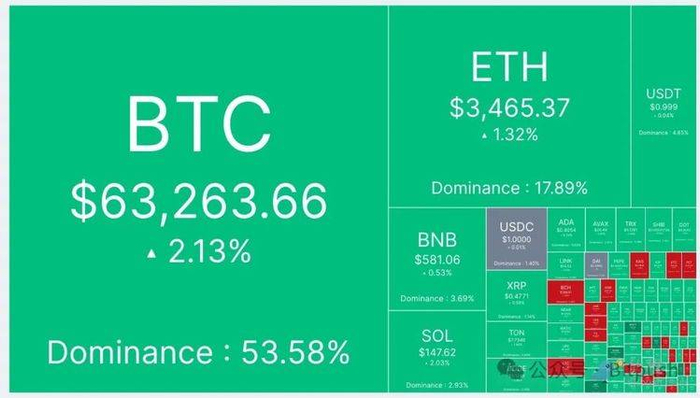 比推数据显示,比特币(BTC)早盘回升至 62,800 美元的支撑位上方,并在午盘后创下 63,820 美元的日高点,截至发稿时,比特币交易价格为 63,263 美元,24 小时涨幅为 2%。