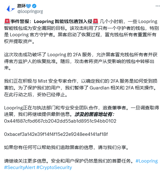 (5) 6月9日,Loopring智能钱包遭到入侵,该攻击利用了只有一个守护者的钱包,特别是 Loopring官方守护者。黑客启动了恢复过程,冒充钱包所有者重置所有权并提取资产。黑客将所盗Loopring资产已全部兑换为以太坊,地址目前持有1373枚ETH,价值超500万美元。