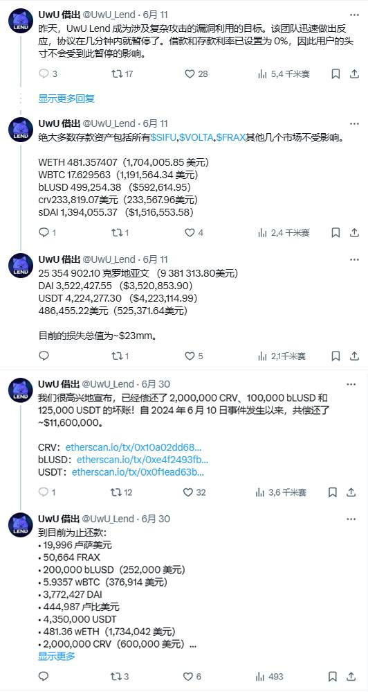 (6) 6月10日,UwU协议遭受黑客多次闪电贷攻击,损失近2000万美元。黑客已将不同资产(比如WBTC和DAI)从池中抽出并转换为ETH。目前UwU称已经偿还2,000,000 CRV、100,000 bLUSD和125,000 USDT的坏账。自2024年6月10日事件发生以来,共偿还了11,600,000美元。