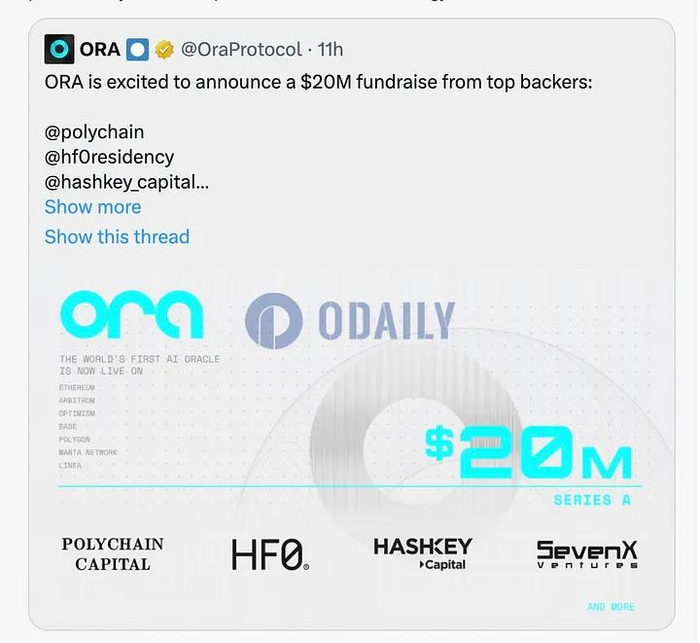 正是如此,VC看中其背后的商业潜力,在Ora Protocol推出后,先后获得了2轮融资,筹集资金2300万美元。投资者包括: