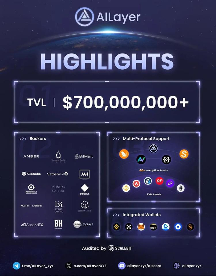 AILayer 是率先在比特幣 Layer 加入 AI 概念的 L2 项目,官方定义为採用 Web 3.0 + AI 应用且支持符文协议的比特幣二层网络,其也是是 AI 敘事中唯一一个发展 BTC Layer2 的项目。在 AI 加持的光环下,AILayer 在比特幣 Layer2 层面还是首个支持铭文、符文创新资產的 BTC Layer2,质押资金支持隨时质押隨时撤出,更加灵活,方便用户操作。最新官网数据显示,主网的链上用户已接近百万,TVL 超 7 亿美金。