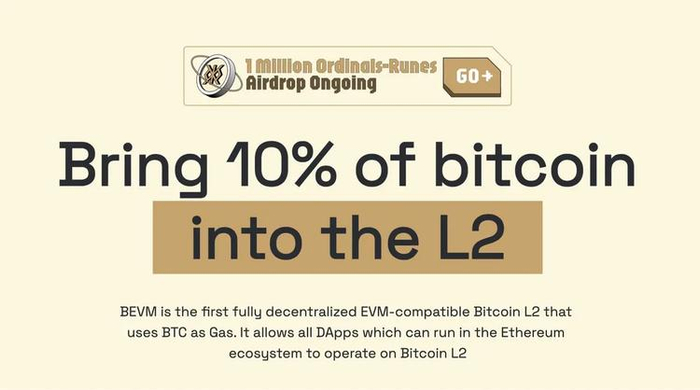 BEVM 是一个以BTC 为GAS 且兼容EVM 的完全去中心化的BTC Layer2 项目,其核心目标是拓展比特币的智能合约场景,让BTC 突破比特币区块链非图灵完备、不支持智能合约的束缚,让BTC 可以在BEVM 这个Layer2 上构建以BTC 为原生GAS 的去中心化应用。