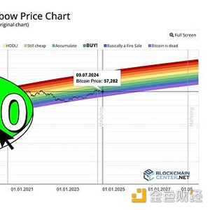 彩虹图是比特币的长期估值工具,使用对数增长曲线来预测比特币潜在的未来价格方向。上方较暖的颜色显示市场何时可能过热,是较好的卖出点;较冷的颜色时表示整体市场情绪通常会低迷,是比较好的买入点。