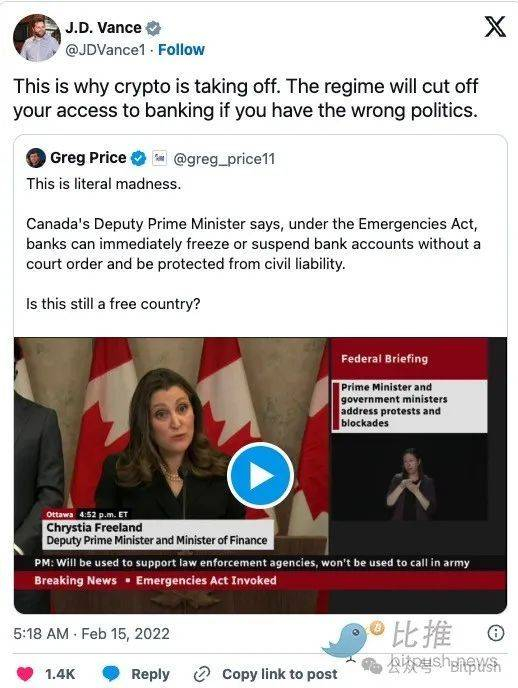 Vance还批评了加拿大政府冻结与 2022 年渥太华卡车司机抗议活动相关人员的银行账户的决定。他当时发帖称:“这就是加密货币蓬勃发展的原因,如果你的政治观点错误,政权就会切断你获得银行服务的机会。”