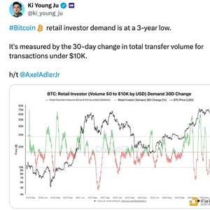 CryptoQuant 创始人 Ki Young Ju 在 7 月 18 日的 X 帖子中写道:“比特币散户投资者的需求处于 3 年来的最低水平”,他的说法基于散户投资者对比特币需求的平均月变化——过去 30 天内已降至负 15% 以下。