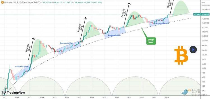 TradingView 分析师 TradingShot 指出,Bitfinex 强调的阻力区与比特币的‘抛物线增长通道’一致,这表明一旦克服这一阻力区,比特币将大幅上涨。