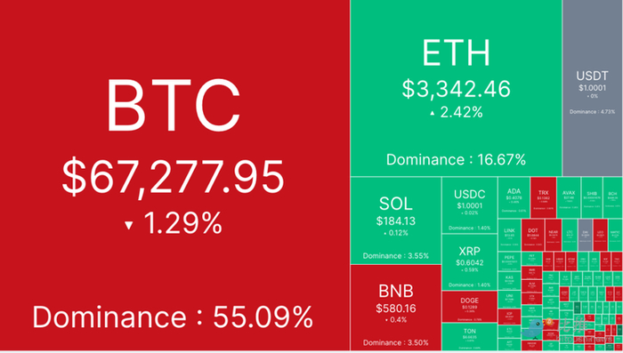 特朗普讲话后,比特币一度回落至 66,650 美元,但周一早盘多头力量再起,将 BTC 推至 70,000 美元的阻力位,市场情绪走高,然而 BTC 接着回落至 67,000 美元的支撑位以下,午盘后跌至 66,393 美元的日内低点。 截至发稿时,比特币交易价格为 67,277 美元,24 小时跌幅 1.2%。