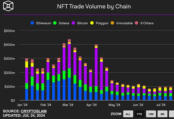 短短12个月内,基于Ordinals的比特币铭文代币总市值就突破35亿美元,展现了惊人的增长速度。即使在今天,比特币网络上每日NFT的交易额都要大于Solana。