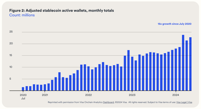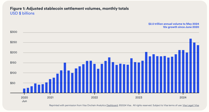 此外,稳定币的交易量也呈现出爆发式增长。2023年,稳定币的总交易量达到近7万亿美元,其中泰达币(USDT)占据了约三分之二的市场份额。根据Visa的Onchain Analytics Dashboard数据显示,即使剔除高频交易和机构大额转账等因素,2024年5月之前的12个月内,稳定币支付结算量仍然达到了2.5万亿美元。这一数据表明,稳定币在全球支付和跨境交易中的应用越来越广泛,市场需求强劲。