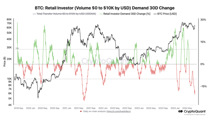 尽管比特币距离 ATH 不足 10%,但如下图所示,以总交易量在 1 万美元以下的 30 天总转账量变化衡量的散户流量处于 3 年来的最低点。