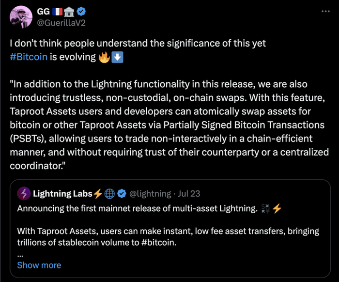 无论如何,闪电网络赛道将继续以缓慢而稳定的方式成长。就像会议召开前,Lightning Labs 宣布(终于)在闪电网络上发布 Taproot Assets 那样,我对这一消息的反应是:「我认为人们还不明白其中的意义,比特币正在进化。」