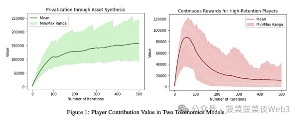 在资产合成私有化模型(左侧)中,我们观察到随着迭代次数的增加,玩家总贡献值呈现出持续的上升趋势,表明该模型能够有效地保持玩家参与并推动长期价值增长。相反,在持续奖励高留存玩家模型(右侧)中,玩家贡献最初呈现出显著上升,但随后显著下降。尽管该模型在早期阶段显示出较高的玩家贡献,但后续迭代中的下降表明在长期内维持玩家参与方面存在挑战。