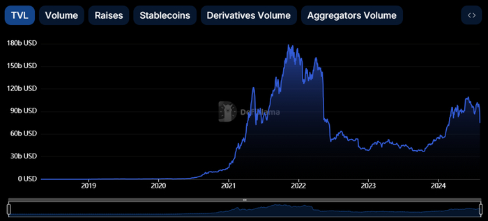 虽然 2020 年‘DeFi Summer’在加密玩家的经历中占据了颇为深刻的一段记忆,但如果严格从时间线角度回顾,会发现整个 DeFi 市场的繁荣也只持续了一年半左右的时间,TVL 等数据的表现最为直观。据 DefiLlama 数据,2021 年 11 月,加密市场整体 DeFi 锁仓量达到约 1800 亿美元的历史高点,随后便一路震荡/下跌,并在 2022 年相继历经 Terra/Luna、Three Arrows Capital、FTX/Alameda 危机,流动性不断被抽干,最终在 2023 年 10 月触及阶段性低点。