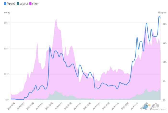 ETH/BTC 比率,即以太坊兑比特币的价格,从 2021 年底以来已经下跌了近一半。而与此同时,Solana 从未如此接近超越以太坊。去年此时,Solana 的市值仅为以太坊的 4%——93 亿美元对 2172 亿美元。现在,它的市值为 22%,660 亿美元对 3076 亿美元。