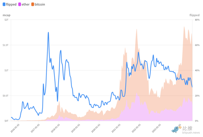 用以太坊(Ether)为例,它已经有三年半没有如此接近于超越比特币了。