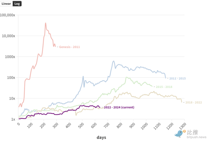 如果我们将不同时期的牛市彼此对比,那么今天的比特币更接近的周期是 2018 年至 2022 年。如上图中的棕色线条所示,它的市场到目前为止的回报率为 278%。
