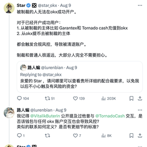 近日,一位名为 Satoshi Friends 的用户因其账户突然被封锁、资金被冻结,在社媒平台对 OKX 交易所发起声讨,并呼吁来自独立国家联合体(CIS)的用户立即从 OKX 提取资金以避免此类风险。随着事件的发酵,OKX CEO Star 回应,“并非无故冻结,该用户账户存在多笔与受制裁交易所或 DeFi 协议相关的交易,且在冻结之前已允许该用户提取干净的资金。”与此同时,他还表示 OKX 交易所将清退与 Tornado Cash 产生交互的账户。