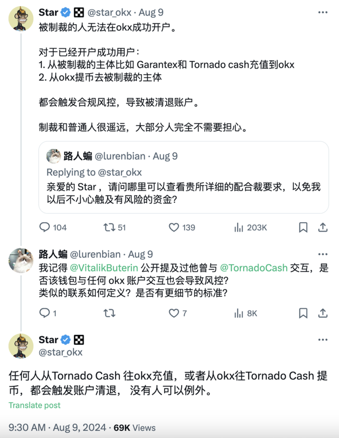 Star 强调,OKX 必须遵守适用的制裁政策,包括美国的制裁,如果用户将来自如 Garantex、Tornado Cash 等被制裁主体的资金存入 OKX 账户,或从 OKX 提币去上述实体地址,都将触发合规风控机制,导致账户被清退。
