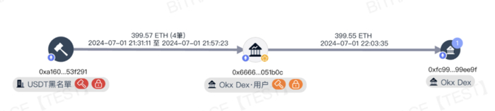 另以 OKX DEX 用户 0x0f99 为例,该地址从有洗钱风险地址获取资金,将 400ETH 转入 TornadoCash 后,继续通过 OKX DEX 将大约 0.23ETH 的「零头」进行了清洗。在这个案例中,OKX DEX 沦为与 TornadoCash 等同的「洗钱渠道」。