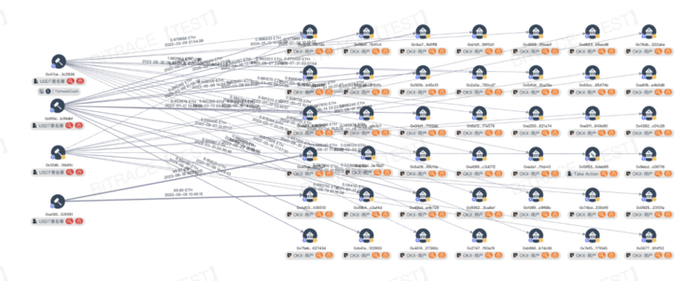 与 OKX 的 CEX 用户相比,其 DEX 用户对 OKX 的资金威胁更大。在审计周期内,Bitrace 共挖掘 199 个 OKX DEX 用户地址,该组地址在审计周期内总共向 OKX DEX 业务地址发起 444 笔共 3323.6ETH 的转账;此外另有 34 个 OKX DEX 用户地址,在审计周期内总共从 TornadoCash 获取 83 笔共 718.4ETH 的风险资金。