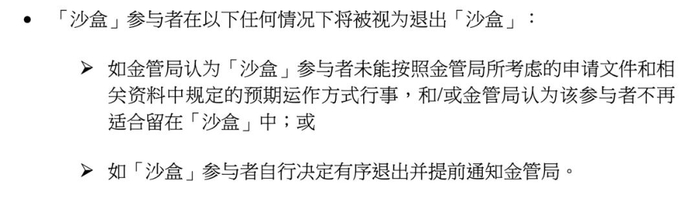 值得进一步澄清的则是,参与监管沙盒不等于获准正式发行,也不等于拿到稳定币牌照。在今年 3 月份,金管局披露的监管沙盒文件中,明确表明了沙盒有退出机制。