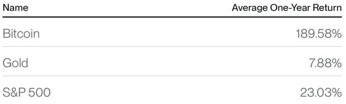 这两种资产的业绩表现讲述了一个完全不同的故事。在股市某日回调超过 2% 的一年后,黄金平均回报率为 7.88%,远远落后于股市的反弹。而相比之下,比特币的平均回报率高达 189.68%。