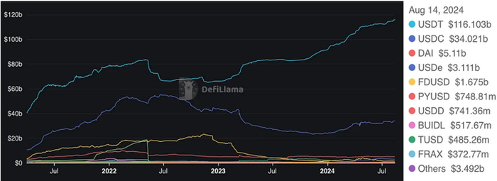 在 5 月中旬,我们在之前的新闻简报中(可在此处查看)详细讨论了稳定币的机制。自那以来,我们没有观察到任何显著的市场波动。USDT 依然是市场的领导者,保持稳定增长,目前市值约为 1160 亿美元。