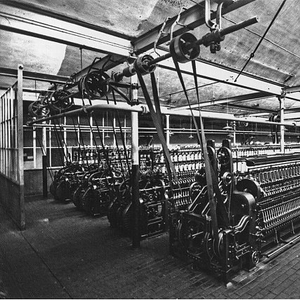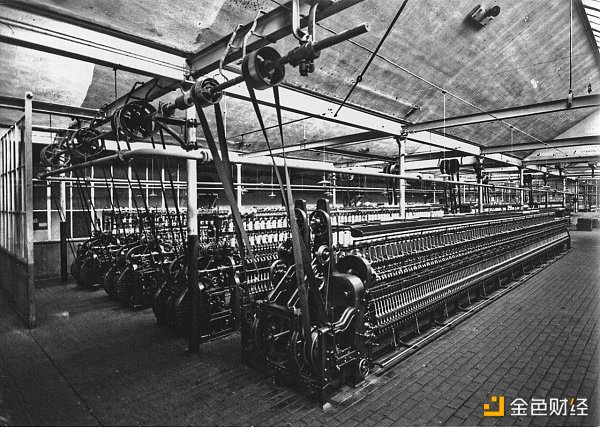 因为他在演讲里没有具体展开,所以我还特别去查了一下相关背景。大致是这样的:在蒸汽机时代,一间工厂通常只有一个集中的蒸汽机动力车间来提供全部的动力,为了将动力传送到各个车间,以及适应不同工序对于动力的不同需求,通常工厂会安装一套天轴动力传输系统。天轴一般悬挂在厂房天花板之下,所以叫天轴,由集中的蒸汽机动力机房带动,在机器上方旋转。而天轴下方的机器,通过齿轮和皮带再把动力传送到机器上,如下图所示。
