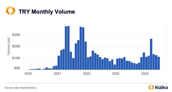 1、土耳其里拉在加密货币交易中的增长:过去四年里,土耳其里拉的交易量从几百万美元增长到了超过100亿美元。在2024年,TRY交易对的月交易量连续八个月超过100亿美元,这是有记录以来最长的持续高交易量期。全年累计交易量约为950亿美元,几乎与2023年全年的交易总量相当。