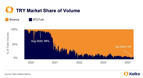 4、Binance的市场主导地位:虽说Gate.io、KuCoin 和 OKX 等其他几家交易所最近也进入了土耳其市场,但他们的市场份额低于1%,而Binance与BTCTurk是土耳其交易者最常用的平台。尽管BTCTurk是最大的本地平台,但其市场份额从2020年的95%下降到2024年的13%。Binance由于其深厚的流动性和较低的交易费用,逐渐占据了市场主导地位。