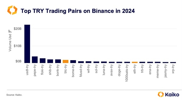 5、稳定币规模扩大:由于土耳其的通胀环境,稳定币的使用量大幅增加。2024年,USDT-TRY是Binance上交易量最大的交易对,超过了220亿美元。