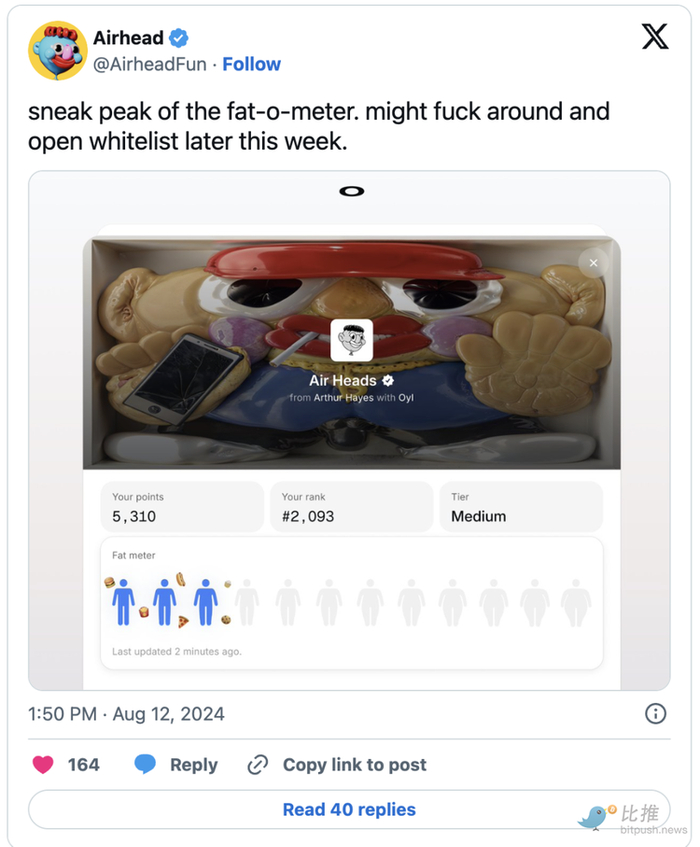 Airhead 项目在社交媒体上的推广内容介于讽刺与搞笑之间。项目创意总监兼 Oyl 的产品负责人 Cole Jorissen 表示,这个系列调侃了「身体自爱运动」。他说道:「我们正在使财富作为角色特征——胖意味着富有。」