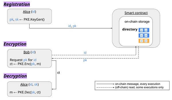 当用户想要注册一个身份得时候,首先需要生成一对密钥(公钥和私钥),或者使用已经生成的密钥对,将其身份ID和公钥发送到智能合约(可能还会支付一定费用),智能合约会检查这个ID是否已经被别人注册过。如果没有被占用,智能合约就会将这个ID和公钥添加到目录中。一旦注册完成,任何人都可以通过询问智能合约来获取某个ID对应的公钥,以便加密发送消息给该用户,如果发送者之前已经加密过消息给这个用户,并且已经有了该用户的公钥,就不需要再次向智能合约请求公钥。有了公钥后,发送者可以像平常一样使用它来加密消息,然后将加密后的消息发送给接收者,接收者使用对应的私钥来解密消息,恢复原文。