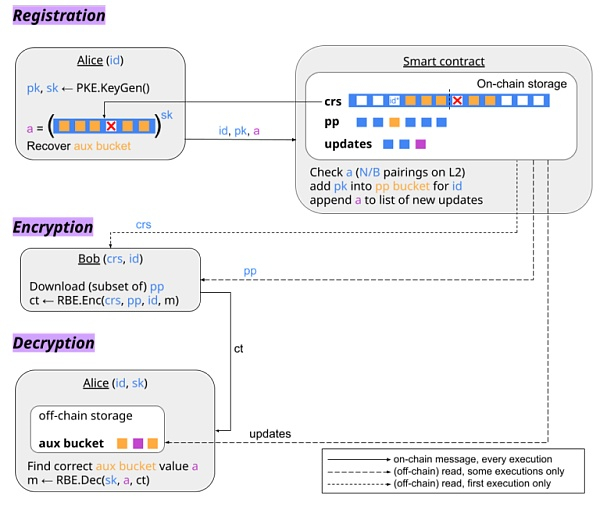 在RBE系统中,每个用户自己生成一对密钥(包括公钥和私钥)。用户还需要基于他们的私钥和一个公共参考字符串(CRS)来计算一些更新值(图中标记为 a)。这些更新值用于系统中的进一步操作。公共参考字符串(CRS)的存在意味着系统的设置并非完全不需要信任。然而,CRS的生成过程采用了一种称为 tau 的幂的构造方法。这种构造方法可以在链上通过多个参与者协作计算完成。只要有至少一个参与者是诚实的,这个 CRS 就是安全的。