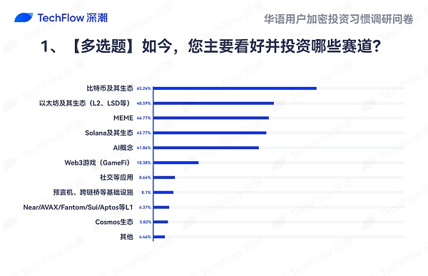 本次问卷调研中,我们对受访者当前关注的加密赛道进行了详细统计,本题为多选题,每名受访者需选择三个感兴趣的选项,各选项占比如下:
